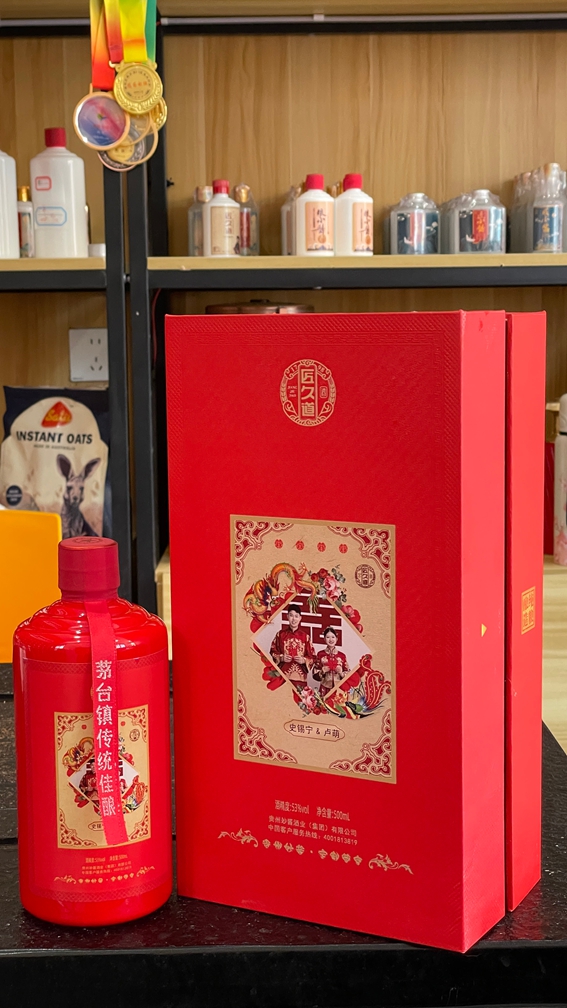 婚宴定制酱酒指新人根据婚礼主题、预算及个人喜好,选择特定年份及风格的酱香型白酒,并在瓶身、礼盒上印制新人姓名、婚期、祝福语等专属元素,用于婚宴招待及宾客伴手礼。